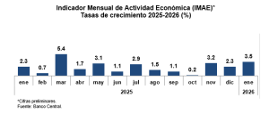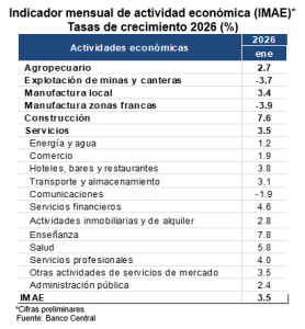 Las cifras preliminares del Indicador Mensual de Actividad Económica (IMAE) correspondientes al mes de enero de 2026 muestran una expansión interanual de 3.5%, resultado principalmente del desempeño favorable del valor agregado real del sector construcción (7.6%), manufactura local (3.4%) y de las actividades del sector servicios en su conjunto (3.5%). Dentro de estas últimas se destacan hoteles, bares y restaurantes (3.8%), intermediación financiera, seguros y actividades conexas (4.6%), enseñanza (7.8%), salud (5.8%), servicios profesionales (4.0%) y otras actividades de servicios (3.5%).